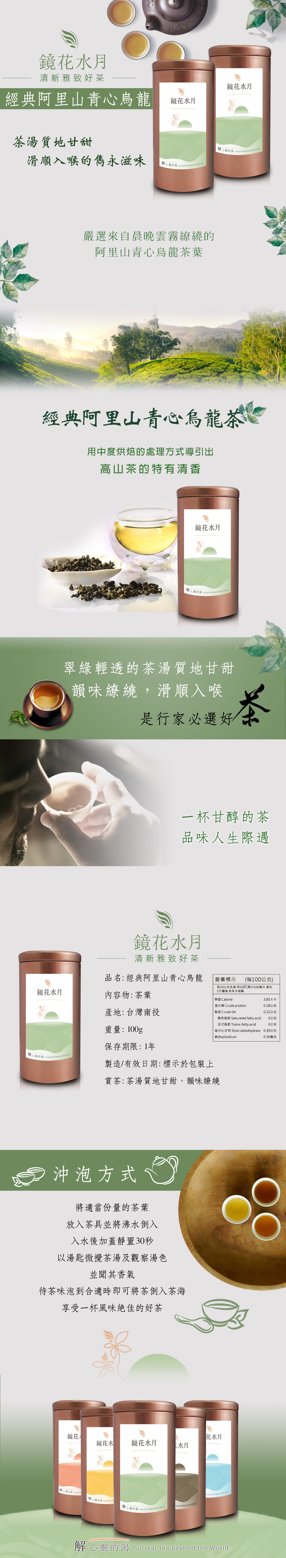 嚴選來自晨晚雲霧繚繞的阿里山青心烏龍茶葉,用中度烘焙的處理方式導引出高山茶的特有清香,翠綠輕透的茶湯質地甘甜、韻味繚繞,滑順入喉的雋永滋味,完美詮釋台灣原味茶的上等好味道。