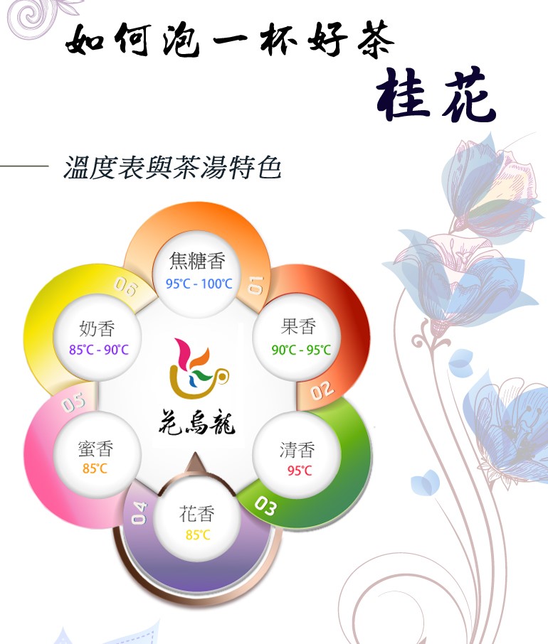 桂花是具有柔和香氣的香花植物,在早期人們就使用它來沁茶,提升茶湯的美味,一般在台灣所看到的桂花品種,可分為香水桂花、繡球桂花、四季桂花還有台灣老欉的“土桂花”,其中以台灣本土桂花樹所產的桂花品質最佳,非一般桂花能比擬。而花開於農曆八月之後,樹高約莫二層樓高,近來因為氣候異常,常常花開後花本身卻無充分花水,無法沁茶完整,需少量多次採收,費時費工,只為讓你享受這入口感動的滋味。
