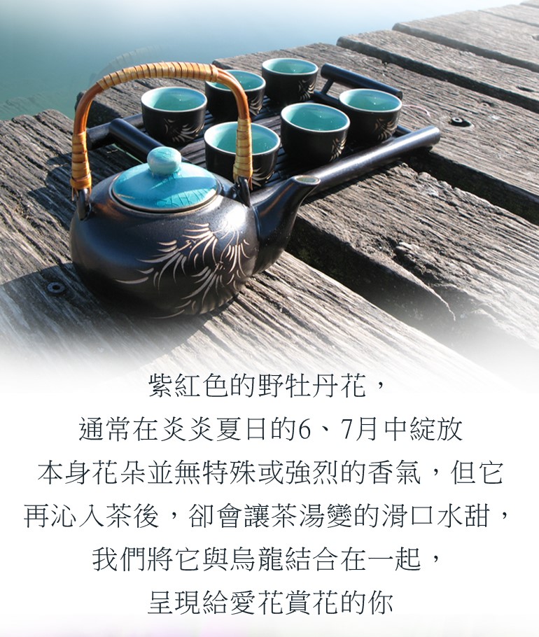 紫紅色的野牡丹花,通常在炎炎夏日的6、7月中可以看到它俏麗地綻放在山區裡,本身花朵並無特殊或強烈的香氣,但它再沁入茶後,卻會讓茶湯變的滑口水甜,在以前醫療不甚發達的年代中,許多人會用它的莖葉來做舒筋活血的作用,我們將它與烏龍結合在一起,呈現給愛花賞花的你。