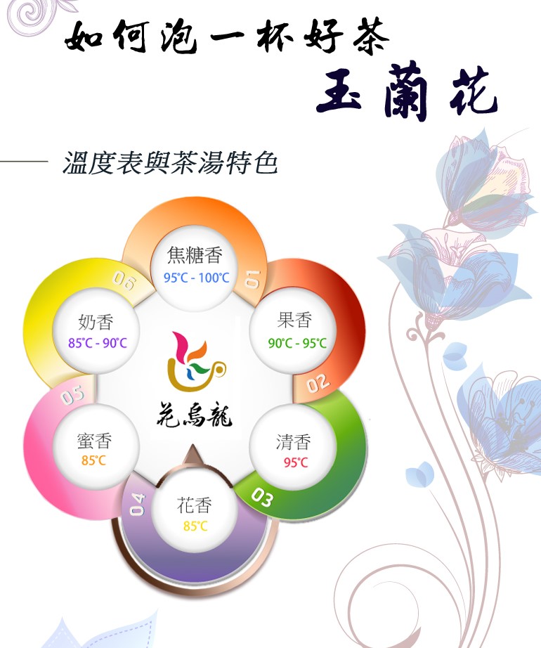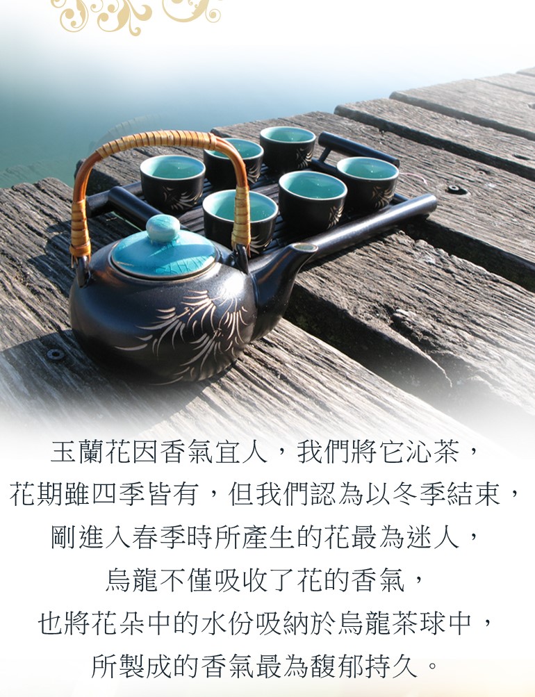 玉蘭花又稱白玉蘭,因為香氣宜人,我們將它沁茶,花期雖為四季皆有,但我們認為以冬季結束,剛進入春季時所產生的玉蘭花最為迷人,我們使用微酸性的有機土壤進行植物栽培,並將採收的花茱與烏龍一起發酵,讓烏龍不僅吸收了玉蘭花本身的香氣,也將花朵中的水份依依的吸納於烏龍茶球中,所製成的香氣最為馥郁持久,口感也是最為甜美迷人。