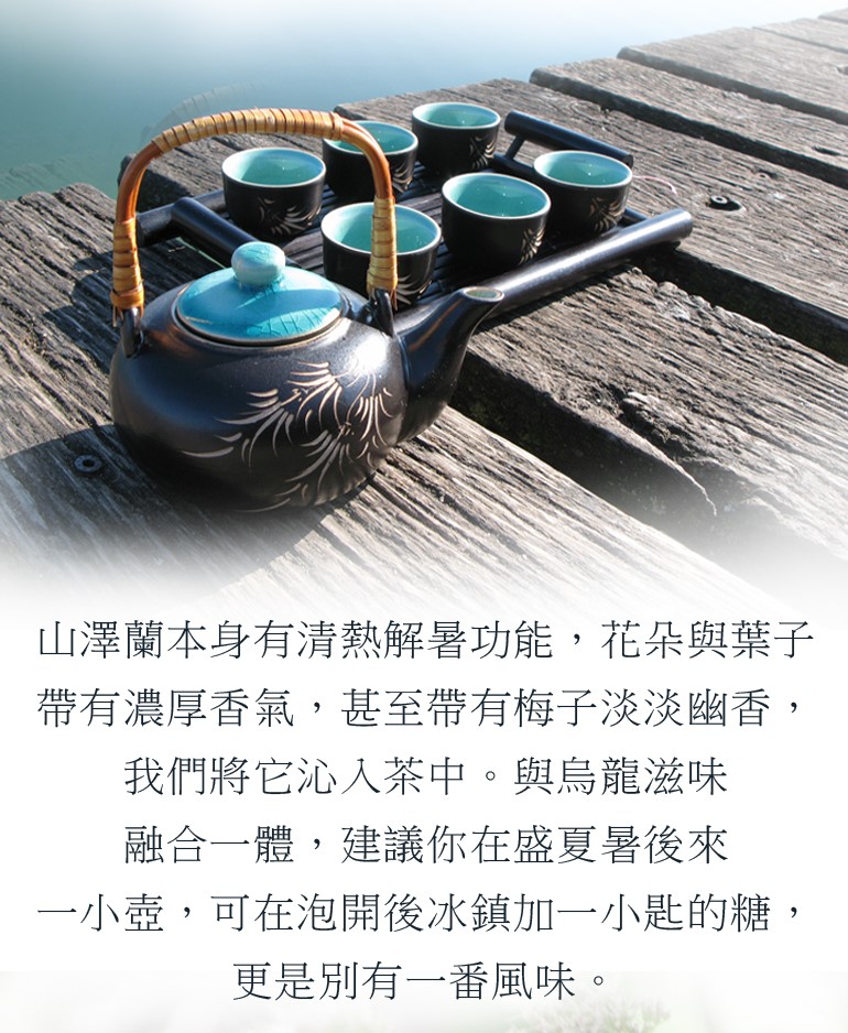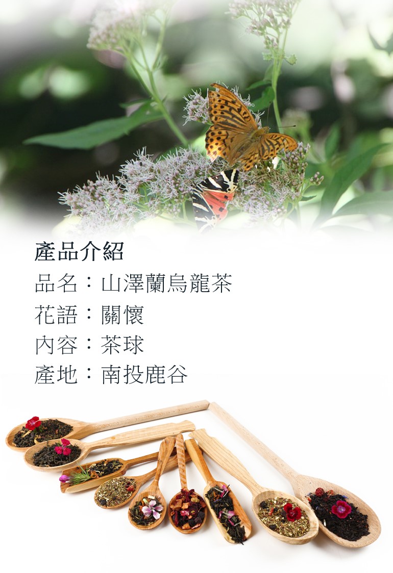山澤蘭,在某些高海拔原生部落,人們將它採收洗淨,做為像是我們平時所喝的青草茶飲用,本身有清熱解暑功能,它的花朵與葉子帶有濃厚香氣,甚至帶有梅子淡淡幽香,我們將它沁入茶中。讓烏龍滋味慢慢與它融合一體,建議你在盛夏暑後來一小壺,或亦是泡開後冰鎮加一小匙的糖,味道不錯別有一番風味。