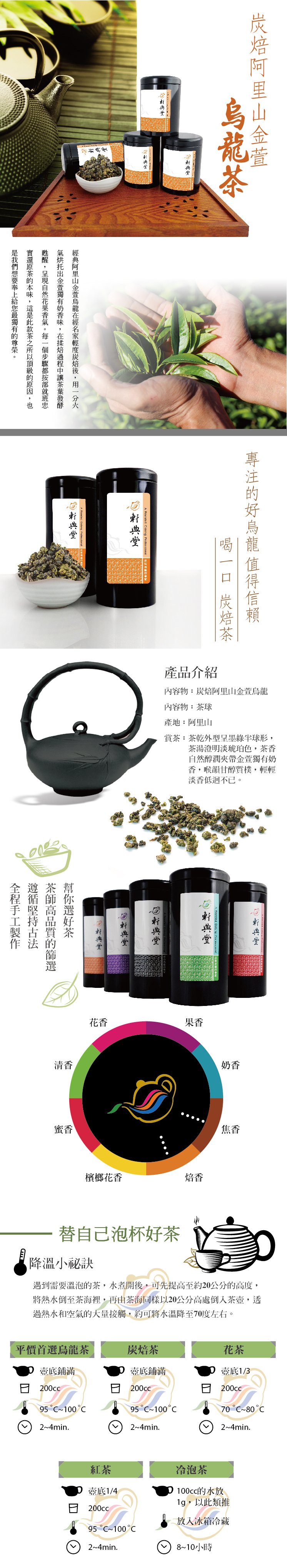 此茶款產自台灣品質最優良的高海拔阿里山茶區,製成烏龍茶後完美呈現金萱奶香,加上高山茶特有優勢,冷氣充足,喉韻濃厚,讓茶口感更加溫順,甘甜而不膩口。金萱茶本就廣受年輕女性消費者及入門茶友喜愛,而軒典堂經典阿里山金萱烏龍更是值得您細細品味的箇中翹楚。