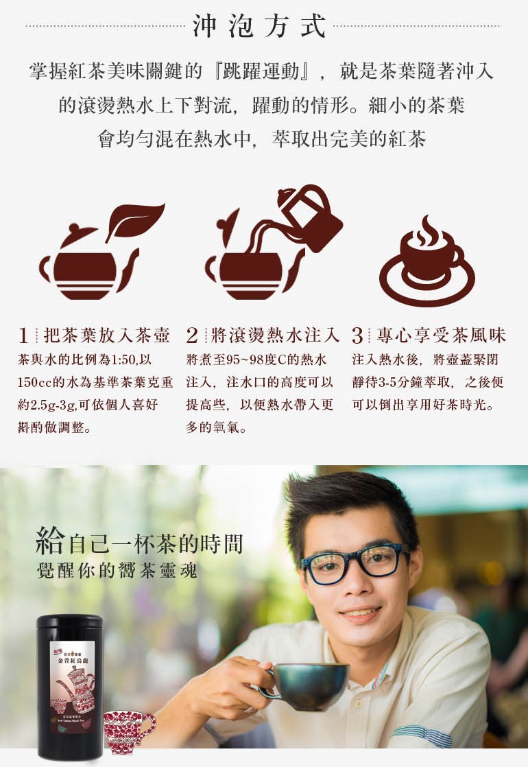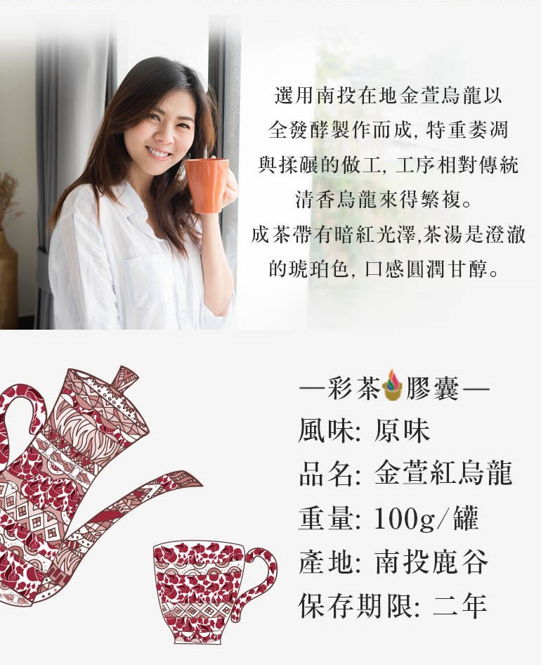 選用南投在地金萱烏龍以全發酵製作而成,特重萎凋與揉碾的做工,工序相對傳統清香烏龍來得繁複。成茶帶有暗紅光澤,茶湯是澄澈的琥珀色,口感圓潤甘醇。