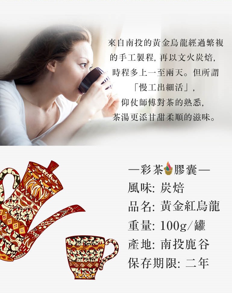 來自南投的黃金烏龍經過繁複的手工製程,再以文火炭焙,時程多上一至兩天。但所謂「慢工出細活」,仰仗師傅對茶的熟悉,茶湯更添甘甜柔順的滋味。