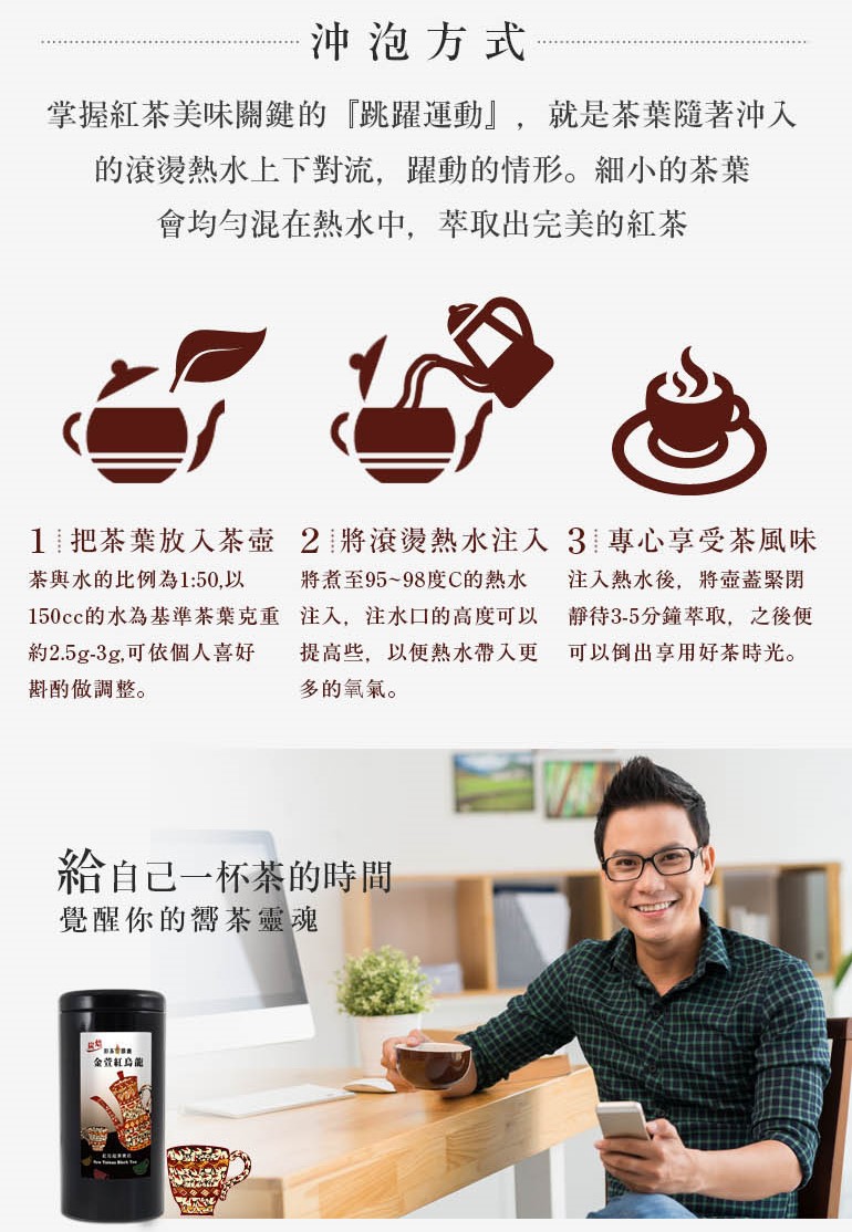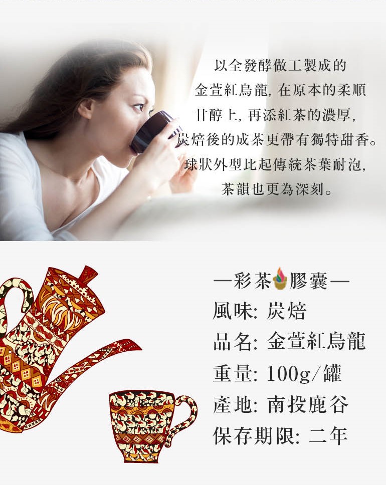 全発酵で精製した金萱紅烏龍茶です。元々の柔らかな甘さのなかに濃厚な紅茶の風味が加わり、炭火焙煎によって独特なフルーツの香りが漂います。球状の外見で伝統的なお茶と比べて耐泡性が強く、 余韻がしっかり残ります。