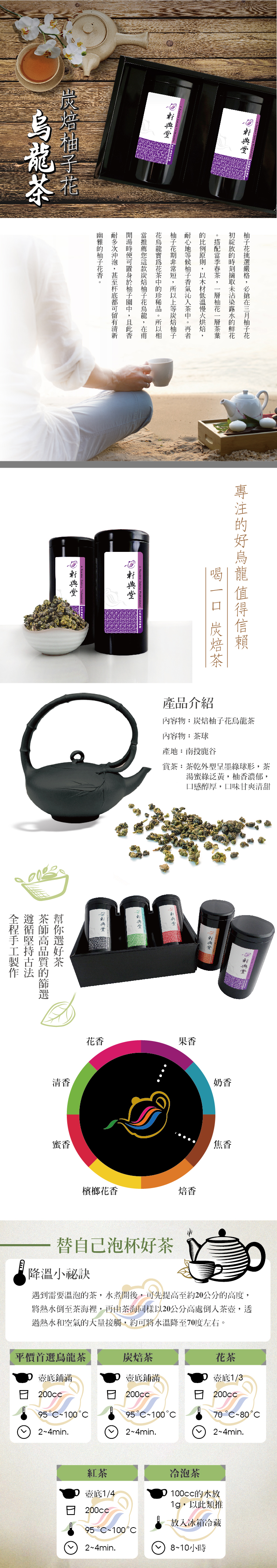 From a limited selection of pomelo flower, which blooms around March, only undewed pomelo flower is harvested for spring-season tea, and as roasted mildly in low-temperature, with a layer of pomelo flower versus a layer of tea leave, pomelo aroma is fused throughout the entire aromatic spectrum of this tea.