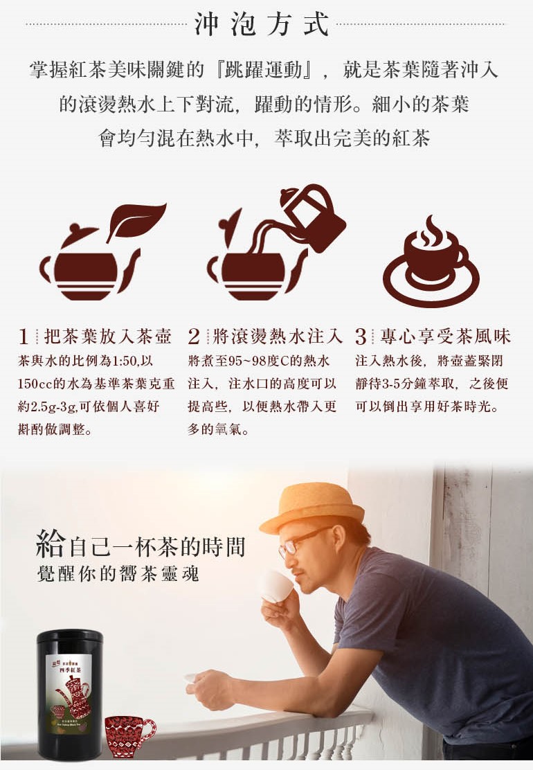 特選小葉種四季烏龍製成的紅茶,有著特別的甜蜜茶香,經過龍眼木烘焙後,茶湯色澤清麗、口感甘潤滑順,混合了木質調與熟果香氣,淺嘗一口,風味絕佳。